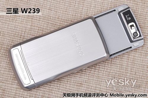 機身背面風格和正面保持了一致,金屬拉絲處理方式被應用在塑料電池蓋上,雖然材質不同,但是依然能保持金屬質感。三星的銘文成為背面的主要點綴,130萬像素的攝像頭隱于滑蓋之下,很好的保護了鏡頭不受損傷。