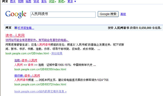這兩天,你如果通過谷歌檢索“人民網(wǎng)讀書頻道”,檢索結(jié)果里會(huì)發(fā)現(xiàn)這樣的提示:“該網(wǎng)站可能含有惡意軟件,有可能會(huì)危害您的電腦!
