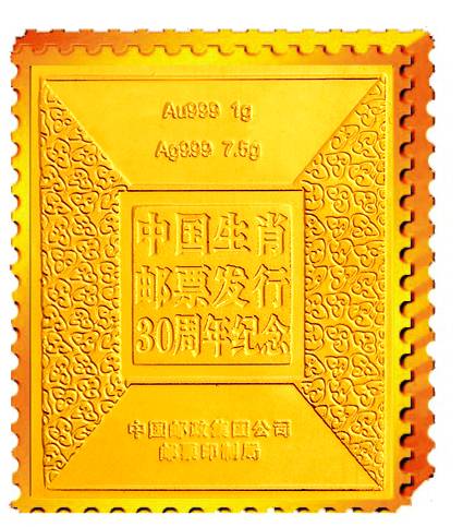 2010年是中國首輪12生肖郵票發(fā)行30周年紀念,近日,由中國郵政集團公司郵票印制局監(jiān)制的第一套“首輪12生肖郵票金磚”正式發(fā)行。此舉結(jié)束了“生肖郵票”和“賀歲金磚”每年都只能各自獨立發(fā)行一枚的歷史,一舉實現(xiàn)了擁有一套生肖藏品,就能同時擁有二個生肖大全套的夢想。