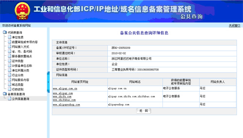 記者同時在工信部域名備案系統(tǒng)查詢發(fā)現(xiàn),相關(guān)域名已經(jīng)于2010年2月2日通過審核,申報單位為浙江阿里巴巴電子商務有限公司,且域名所匹配的ICP證號正是目前支付寶所使用的ICP證號。