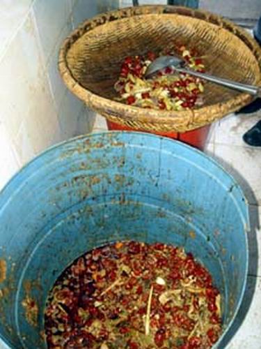 昨日下午,記者以顧客的身份來到該火鍋店,無意中在洗刷間看到,里面排放著2只一大一小臟兮兮的潲水桶。記者走近一看,發(fā)現(xiàn)大桶里有很多剩菜,包括暗紅的辣椒、蔬菜、鴨血、餐巾紙、煙頭、筷子等各種雜物。旁邊的一個(gè)小桶上擱著一個(gè)竹筐和一把勺,筐中已經(jīng)盛了許多辣椒和大蒜等剩菜。記者詢問一名進(jìn)來端盤子的服務(wù)員,撈起這些剩菜做什么用途時(shí),對方稱老板規(guī)定,客人吃剩的菜不能隨便倒,還可以用。但該服務(wù)員很快就意識到說漏了嘴,立即問記者進(jìn)洗刷間做什么。記者再問,對方三緘其口。