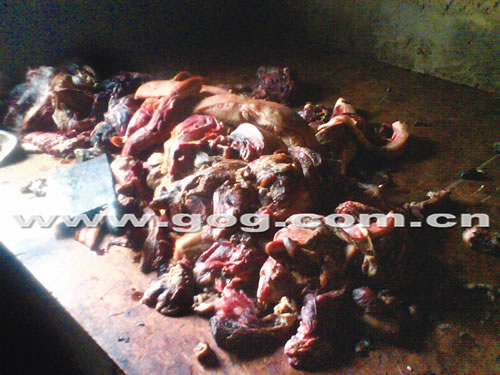 記者昨日(1月13日)在現(xiàn)場看到,一間不大的瓦房內(nèi)掛滿了熏制好的臘肉,約有百余條,地上還有很多松枝燃燒后剩下的灰燼,此臘肉外觀的顏色和市場上所賣的正規(guī)臘肉差不多,但仔細(xì)辨認(rèn)會(huì)發(fā)現(xiàn)其還有很多豬毛沒有完全剃掉。緊挨著該加工房的是一間大一點(diǎn)的屋子,其為初加工房,剛走近該屋記者立刻聞到一股酸臭味,制作臘肉的原材料隨意的丟棄在水泥地上,而且部分豬肉已經(jīng)變色發(fā)臭。該屋里還擺放有幾個(gè)盆和大桶,里面存放的黑色液體估計(jì)是用來腌泡臘肉的醬汁。