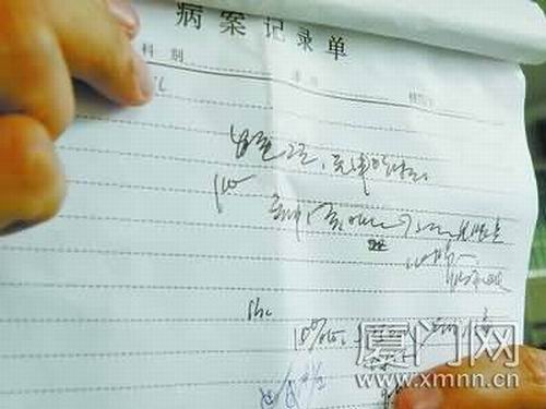 1日下午,在市內(nèi)某大醫(yī)院的兒科候診區(qū),記者隨手向一名帶孩子前來復(fù)診的家長(zhǎng)借了份病歷,一看就懵了:除了“09.2.1”的日期和表示藥物劑量的幾個(gè)阿拉伯?dāng)?shù)字能看清,其他字跡根本無法辨認(rèn)。“醫(yī)生寫字都是這樣!边@位家長(zhǎng)說,他從來就不去看病歷,看了也看不懂。