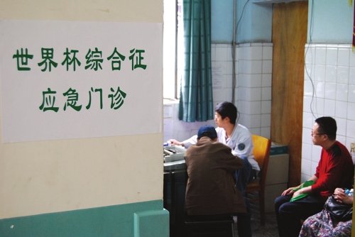 9名醫(yī)生中除了一名女醫(yī)生,其他的人全是球迷。世界杯期間,為了滿足球迷患者的需要,急診科輸液室的大電視凌晨也會播放比賽。但“世界杯綜合征應(yīng)急門診”的醫(yī)生們卻沒有這么幸運(yùn),為了保證工作質(zhì)量,門診室內(nèi)不會設(shè)電視機(jī)。急診科副主任項(xiàng)濤說:“沒法,工作為主,只能看轉(zhuǎn)播了。”