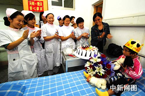 “祝你生日快樂, 祝你生日快樂”, 9月28日上午9時許,從江西九江學(xué)院附屬醫(yī)院住院部八樓的光明.微笑愛心病房里傳出歡快的生日祝福歌,醫(yī)護(hù)人員正在給小患者小胡慶祝生日。