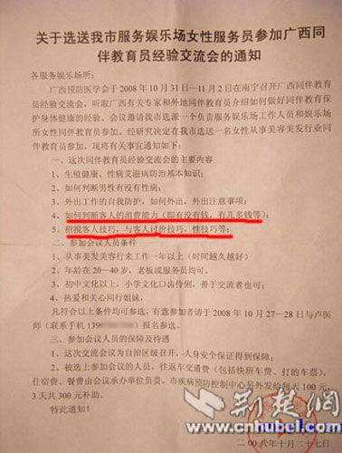 通過“糜瑞蘭”上傳的宣傳單照片,可以很清楚的看到這份全稱為《關于選送我市服務娛樂場女性服務員參加廣西同伴教育員經(jīng)驗交流會的通知》的宣傳單中,抬頭為“各服務娛樂場所”,落款為“宜州市疾病預防控制中心”并蓋有相應公章,其正文中列明交流會的主要內(nèi)容包括“……4、如何判斷客人的消費能力……5、招攬客人技巧,與客人討價技巧,性技巧等”。該圖文內(nèi)容隨即被多個論壇轉載。