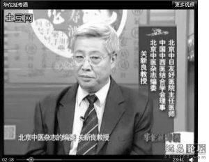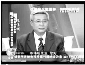 在一家電視臺播出的億康納米能量杯的廣告中,一位學(xué)者打扮的人端坐當(dāng)中,文字顯示,他叫陳偉明,是中國醫(yī)促健康飲水協(xié)會理事。而在另一幅華佗延壽酒的廣告視頻截圖中,還是那位“陳偉明”,可文字顯示其姓名卻變成了關(guān)新良,身份也變成了《北京中醫(yī)》雜志編委、中國中西醫(yī)結(jié)合協(xié)會理事、北京中日友好醫(yī)院主任醫(yī)師。第三幅截圖來自天地磁療儀的電視廣告,這個“陳偉明”又成了一名心臟病患者,一臉痛苦表情。