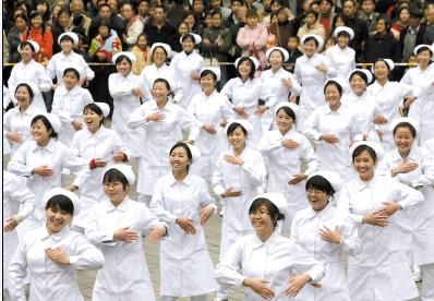 昨日,解放碑,300護士跳“乳房保健操”。解放碑中心廣場音樂飛揚,一群“護士小姐”排著整齊的隊伍,擴胸、伸展、按摩……一個個優(yōu)雅但不失力度的動作,展示著健康的活力。隊伍的表演吸引著大批過往的行人駐足觀看。原來,在三八婦女節(jié)到來之際,為響應(yīng)重慶市委市政府建設(shè)“健康重慶”的號召,醫(yī)護人員舉辦了“健康重慶,關(guān)愛婦女”大型公益活動,F(xiàn)場二十名專家的義診活動,巧妙地向市民傳達乳腺保健的意識以及日常防病治病的知識。(記者 劉嵩 攝影報道)