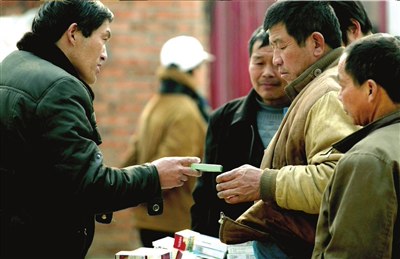 在關(guān)東店停車場(chǎng),呼家樓交通隊(duì)門(mén)口前的巷子里,有人向附近工地的民工和市民出售藥品,包括一些常見(jiàn)的感冒藥、消炎藥以及軟膏等。2月21日,家住朝陽(yáng)的肖先生向本報(bào)提供了上述信息。肖先生說(shuō),這伙人是半個(gè)多月前才出現(xiàn)的,一共三人,推著堆積著藥品的三輪車和電動(dòng)車趁著夜色出沒(méi)!八麄円矝](méi)穿正規(guī)的醫(yī)藥行業(yè)的衣服,出售的藥品要比藥店便宜很多,每天晚上7點(diǎn)多出現(xiàn),到10點(diǎn)多才走!