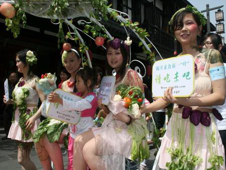 這些披菜葉的美女自稱蔬菜女孩,活動則由某善待動物組策劃推動。針對路人所說穿得少的噱頭,主辦方告訴記者,今天活動女孩子們專門在菜葉下面穿了背心和短裙,“該活動之前在廣州舉辦過,出場的性感外國女孩只穿了內衣褲呢!