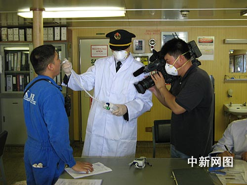 外高橋邊檢站民警告訴記者,巴拿馬籍“曼哈頓橋”輪于昨天(5月5日)上午8時(shí)靠泊外高橋碼頭。該輪由于途徑甲型H1N1流感疫情較重的美國(guó),且船上有一名菲律賓籍船員體溫異常,邊檢和衛(wèi)檢啟動(dòng)聯(lián)動(dòng)應(yīng)急預(yù)案,在第一時(shí)間對(duì)其進(jìn)行了專門檢查和檢疫。