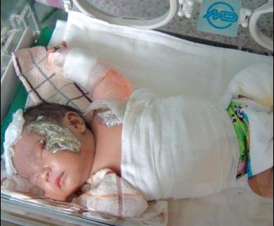 我的孩子啊,你才出生24天,你是如此的脆弱,還沒有來得及看這個世界,就受到如此非人的折磨,媽媽多么希望能代替你去承受這一切的災(zāi)難與痛苦。當媽媽聽到你第一聲啼哭,當你第一次依偎在我懷里,心中歡喜之情無以言表,從此世間再沒有什么比你更重要,我還沒有來得及記住你可愛的笑容,你就已經(jīng)面目全非了……一想到你將來不能像正常人那樣行走,不能像正常人那樣生活的時候,我就萬念俱灰,心如刀絞,你我該如何面對漫漫人生之路,我該如何向你解釋?這又是誰之過呢???