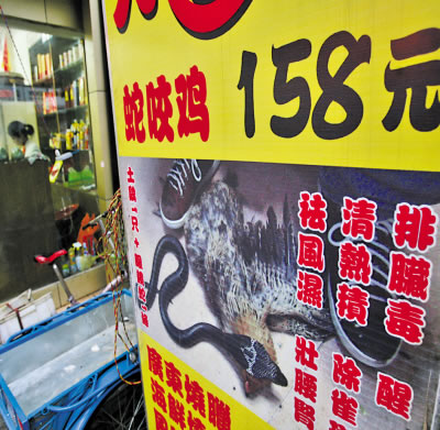 “打死我都不敢吃!”市民劉先生在黃泥塝看到某餐館推出的“蛇咬雞”招牌后說,這些吃法太怪了。劉先生介紹,招牌上還說,吃“蛇咬雞”可以醒腦、除雀斑、排臟毒、祛風濕等!斑@不僅太殘忍,太血腥,也不道德。”張女士說,希望這僅僅是個別餐館吸引顧客而搞的噱頭。