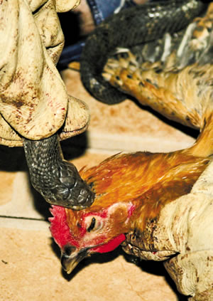 “表演馬上開始!”店里所有顧客都將眼光齊刷刷地盯著該男子的手。只見他左手將母雞死死按在地上,右手從鐵籠中隨手抓了一條長約1米的眼鏡蛇,用手卡住它的頸部!芭尽⑴尽⑴!”只見男廚師不停地拍打著蛇的頭部,試圖激怒它,但眼鏡蛇仍一動不動。“怎么不咬呢?”幾名男子哈哈大笑,一些食客也一撥接一撥地走了進來。