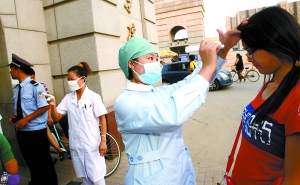 昨日,該校各個大門都有保安值守,檢查進出人員的證件,并對入校人員進行體溫檢測。一份23日發(fā)布的緊急通知稱:根據(jù)學校甲型H1N1流感形勢及上級防控特殊要求,開學第一周確定為甲流緊急防控期,教職工、學生必須體溫檢查。