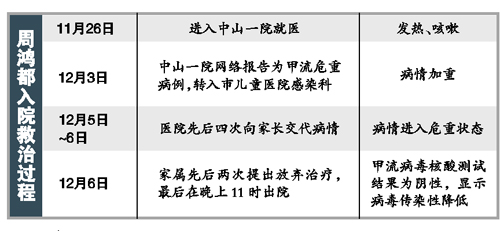 兒童醫(yī)院副院長龔四堂稱,入院時周鴻都呼吸急促、血氧飽和量低、心率快、反應(yīng)差,當時就上了呼吸機,并且接受抗感染、糾正貧血等治療,入院的初步診斷是甲流、急性支氣管肺炎、呼吸衰竭、血小板減少性紫癜。到了第二天,他在呼吸機幫助下血氧飽和度已經(jīng)維持到正常水平,胸片顯示肺部大片感染,給予達菲等藥物治療。到了12月5日、6日兩天,他的病情進入危重狀態(tài)。根據(jù)通報,在12月6日,周鴻都的家屬共10多人來到醫(yī)院,先后兩次提出放棄治療,自動出院。