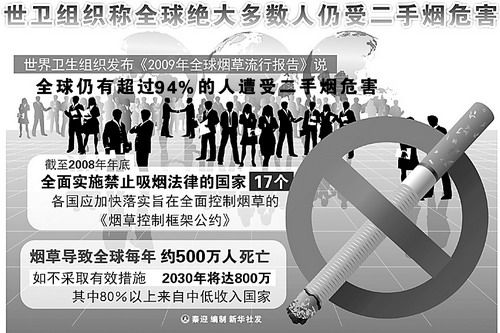 2008年10月30日,來自全國的400家環(huán)保民間組織的代表在北京發(fā)出共同聲音:吸煙是污染環(huán)境的行為,應當維護被動吸煙者、維護環(huán)境的合法權益。他們呼吁盡快制定并頒布控煙特別是公共場所禁煙的法律、法規(guī),并有效監(jiān)督實施。根據(jù)中華環(huán)保聯(lián)合會《被動吸煙的調(diào)查問卷報告》,85%的受調(diào)查公眾不清楚被動吸煙對人體健康造成危害的嚴重性。而目前,我國的吸煙人數(shù)達到3.5億,被動吸煙人數(shù)高達5.4億。我國于2003年11月10日簽署了世界衛(wèi)生組織的《煙草控制框架公約》,2006年1月9日,該《公約》在我國生效。