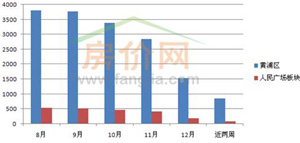 從板塊掛牌量來(lái)看,黃浦區(qū)近兩周掛牌的新房源僅為850套,人民廣場(chǎng)板塊為95套。此外,黃浦區(qū)總掛牌量為3857套,人民廣場(chǎng)板塊總掛牌量為545套。