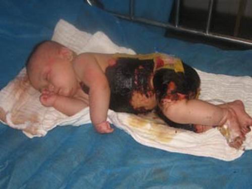 昨日(12月30日),記者在187醫(yī)院燒傷科307房看到,男嬰黃堂國(guó)躺在床上,前胸、右腿和臀部等被嚴(yán)重燙傷,燙傷處被涂上了厚厚的藥膏。黃堂國(guó)的父母在病床前不停嘆息,“因借不到錢(qián),現(xiàn)在醫(yī)院已經(jīng)停止對(duì)孩子用藥了!秉S堂國(guó)的母親告訴記者,她家住?谑旋埲A區(qū)遵譚鎮(zhèn)群力村委會(huì)美萬(wàn)村。12月19日晚,她正準(zhǔn)備給孩子洗澡,當(dāng)時(shí)先往盆里放熱水,正想放冷水時(shí)忽然想起忘了給孩子拿衣服,就在她出去拿衣服時(shí),孩子不慎掉進(jìn)了熱水盆,“當(dāng)時(shí)孩子被燙得哇哇直哭”。