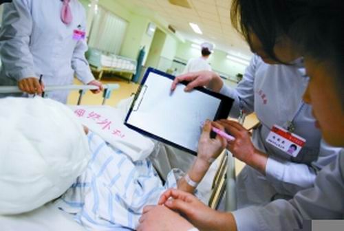 春節(jié)期間,值班護(hù)士有空就為其朗讀文章,誘導(dǎo)趙某開口說話,并在病歷卡上寫上0至9個數(shù)字,讓他把家里的電話號碼給圈出來。