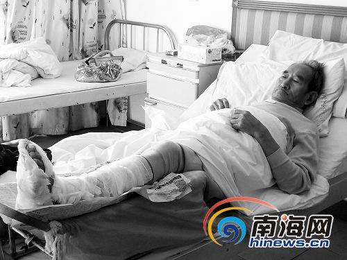 3日下午,記者在海南邊防醫(yī)院見(jiàn)到了受傷的張老漢。老人躺在病床上,左腳纏了繃帶并用木板固定住。張老漢回憶說(shuō),1日下午4點(diǎn)左右,他在博愛(ài)南路過(guò)馬路,打算去附近的東湖站臺(tái)乘坐剛到站的36路公交車(chē)。這時(shí),一輛開(kāi)往博愛(ài)南路方向的摩托車(chē)緊貼著他的身子急速行駛過(guò)來(lái)。摩托車(chē)后輪的輻條將他的左腳“拐”進(jìn)車(chē)輪內(nèi),他覺(jué)得一陣鉆心的疼痛。“之后,我被拖行了2米多,摩托車(chē)才停了下來(lái),我趁機(jī)將腳抽出來(lái),司機(jī)卻開(kāi)著車(chē)跑了”。張老漢氣憤地說(shuō)。