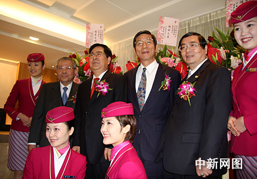 1月15日,大陸南方航空公司在臺(tái)北正式成立辦事處,成為首家在臺(tái)灣掛牌運(yùn)營(yíng)的大陸企業(yè)。圖為開(kāi)業(yè)揭幕儀式典禮上南航空姐與參加儀式的臺(tái)灣和大陸嘉賓合影。中新社記者 陳立宇 攝