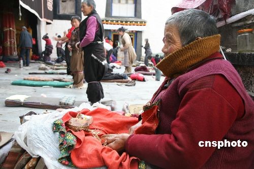 3月14日,藏族信徒一如尋常前來大昭寺轉(zhuǎn)經(jīng)朝拜。唯一不同的是,大昭寺廣場(chǎng)和八廓街顯得格外寧靜,很難看到往日涌動(dòng)的游客,八廓街不少商店和攤鋪還在營(yíng)業(yè)但生意冷清。中新社發(fā) 王林 攝