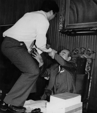 待劉闊才又握住一支麥克風,準備作裁定時,朱高正在高喊“我要求辯論”后雙手一撐,翻上主席臺,以雙手扭扯主席劉闊才,劉闊才在座位上搖搖晃晃,險象環(huán)生。