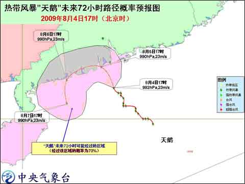 中央氣象臺2009年8月4日18時發(fā)布臺風橙色警報: