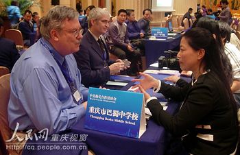 今日(8日)上午,重慶金科大酒店多功能會議廳內(nèi)人頭攢動,重慶多所中小學(xué)的校長及教員在各自展位上擺放好宣傳資料,等待有合作意向的美國校長前來洽談。美方的校長們在展位間穿梭,與“相中”的中方學(xué)校展開零距離的交流。漢語和英語在會場內(nèi)交替使用,使得這場中美漢語教學(xué)合作的“雙選會”氣氛格外熱烈。