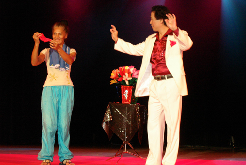 演出從活潑、歡快的空竹表演開始。藝術(shù)小組小演員們嫻熟地抖動、拋起空竹的動作,使現(xiàn)場不時爆發(fā)出熱烈的掌聲和歡呼聲。魔術(shù)演員敏捷的變幻手法則讓學生們睜大了好奇的眼睛。接下來的鉆桶、轉(zhuǎn)盤子節(jié)目,小演員們以風趣幽默的表演和頂上、手上技巧表現(xiàn)出熱鬧的生活場景,引來學生們陣陣歡笑。柔術(shù)則以柔美的肢體語言和行云流水般的輕盈舞姿,獲得觀眾不停的贊嘆聲。壓軸的川劇變臉、吐火表演又讓觀眾領(lǐng)略了中國傳統(tǒng)戲曲藝術(shù)的獨特魅力。