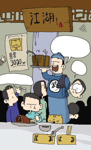 滿嘴“武俠風”的“店小二兒”“怪話連篇”,這家飯店沒有菜單,客人一落座,店小二兒就會找來“二掌柜”的“切磋切磋”,也就是幫客人安排飯菜。在店里,用餐是“加點功力”,手中的筷子是“雙截棍”,牙簽是“暗器”,餐巾紙叫做“抹布”,羹匙是“小李飛刀”。除了給餐廳里的餐具、用品起了新名字之外,在與客人對話時,“店小二兒”嘴里說的也沒幾句“普通話”。上菜時,“店小二兒”高喊:“‘古墓派’添點‘功力’,木桶羊肉——‘九陽神功’一份!笨腿嗽儐枴澳就帮垺钡膬r格,“店小二兒”表示:“一桶五兩碎銀子”。找給客人的零錢,店小二兒稱這是“大俠遠行的盤纏”。客人臨走時,全店的“小二兒”都會一起高喊:“青山不改,綠水長流,后會有期,恕不遠送!