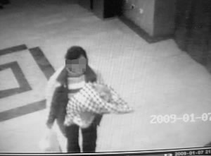 監(jiān)控錄像顯示:一名30歲左右的女子身穿白黑紅三色棉襖或羽絨服,內(nèi)穿兩色條紋毛衣,身高在1米60左右。晚上9點36分40秒,這名女子從西樓的東門進入大樓,當時手中抱著女嬰,用一條花格包被包著,同時右手還提著塑料袋。