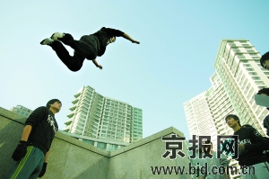 從去年年底開始,關(guān)于這項另類運動的視頻開始風(fēng)靡所有論壇。在視頻中,跑酷者非常流暢地奔跑,遇到圍墻就兩腳一蹬翻過去,從四五米高的地方跳下時就地一滾繼續(xù)前進,從一根欄桿跳到兩三米外的另一根欄桿,能穩(wěn)穩(wěn)地站在上面。這項運動在上世紀90年代興起于法國巴黎,迅速被各國年輕人所接受,去年9月份,倫敦舉辦了世界首個全球跑酷錦標賽。