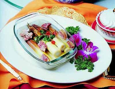(5)春筍:被譽為“素食第一品”的春筍作為美味佳肴,自古以來備受人們喜愛。文人墨客和美食家對它贊嘆不已,有“嘗鮮無不道春筍”之說。春筍筍體肥厚,美味爽口,營養(yǎng)豐富,可葷可素。做法不同,風(fēng)味也各異,炒、燉、煮、煨皆成佳肴。地方名菜春筍均占一席之地,如上海的“枸杞春筍”,南京的“春筍白拌雞”,浙江的“南肉春筍”。不過,北方很難吃到新鮮的春筍,如果是弗爾瑪林里泡過的就算了吧。