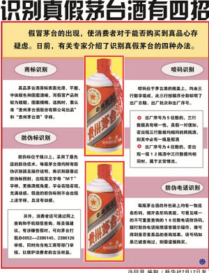 據(jù)她介紹,茅臺(tái)酒廠目前在北京專設(shè)了多名打假人員,通過明察暗訪的方式,尋訪假酒的線索。一旦發(fā)現(xiàn)假酒,將舉報(bào)工商部門或以法院起訴的方式“打假”。她說,目前打假人員還是主要針對(duì)高檔餐廳、酒店和超市進(jìn)行打假。對(duì)一些小的煙酒店所賣的假茅臺(tái)酒,他們暫不作為“打假”重點(diǎn)。莫律師承認(rèn),目前在市場(chǎng)上存在著大量假茅臺(tái)酒,但針對(duì)“出了貴州,就喝不到真的茅臺(tái)”和“茅臺(tái)酒中80%是假酒”的傳言,她表示假酒并無傳言中的那樣多。