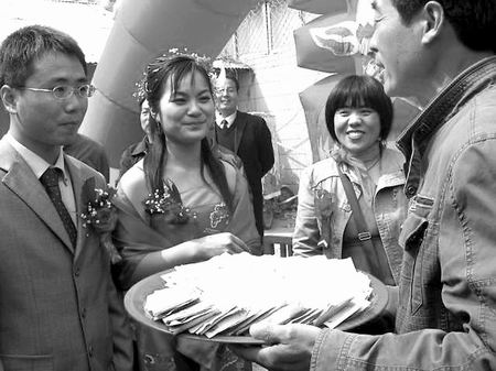“我們想把今天的禮金捐給咱村,用來建設(shè)咱村的老年人活動中心和村文化廣場,用實際行動支持新農(nóng)村建設(shè)!”婚禮剛一結(jié)束,楊宏偉和曹亞麗就拿著所有禮金1.46萬元來到村支書張文安面前說(如圖)。