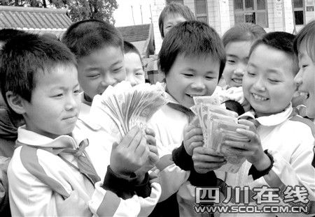 這里距離學(xué)校還有1000多米,8人身負(fù)特殊使命,一路小跑!皥(bào)告老師,我們交錢來了!”教導(dǎo)主任易光勇正準(zhǔn)備去上課,門口擁來的一群孩子送來一大堆現(xiàn)金,令他十分感動(dòng)。在易光勇的幫助下,孩子們把錢分成幾組,大家分頭清點(diǎn),然后統(tǒng)一統(tǒng)計(jì),共有現(xiàn)金8900元。
