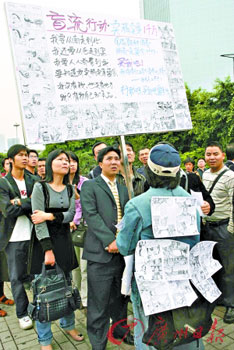 漫畫家名為黃達(dá)沖,在天河體育中心南門廣場(chǎng)舉著一面與他身高差不多的鐵牌,上面展示了他的“三國(guó)英雄前傳”漫畫以及他的宣言:“盲流行動(dòng)·賣稿賣身一千萬(wàn)……”他一身牛仔套裝上前身后背也貼著多張漫畫作品,引得路人圍觀。何謂“盲流”?他解釋道,他是南寧人,來(lái)廣州十年,做過(guò)出版和媒體工作,現(xiàn)在快40歲了,還沒(méi)找到方向,所以認(rèn)為自己是盲流!拔胰ツ11月開始創(chuàng)作‘三國(guó)英雄前傳’,現(xiàn)在完成了一半,今天來(lái)到這里想找人投資。如果有誠(chéng)意的話,私下談價(jià)錢……一千萬(wàn)嘛,不一定是人民幣!痹谂赃呥有一位長(zhǎng)發(fā)壯漢,是黃達(dá)沖的“哥們”,也是一位“自由藝術(shù)家”,正幫著他派傳單。