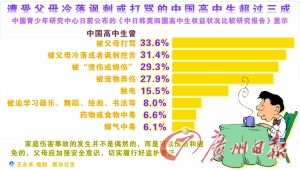 該調查顯示,33.6%的中國高中生曾“被父母打罵”,29.3%被“燙傷或燒傷”。對于父母是否有權利打罵孩子,各國高中生的態(tài)度不一。85.0%的中國高中生反對“父母打罵孩子是自家的事,別人沒有權利干預”,在四國中比例最高。