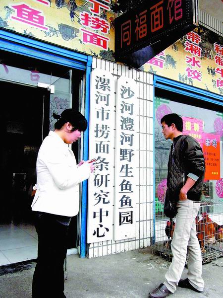 漯河市工商局一位工作人員告訴記者,這家“撈面條研究中心”并沒有注冊,掛這樣的招牌不太妥當,需要整改。(劉廣超文圖)