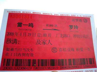 “太牛了,簡直就是個牛人。”昨日中午11時多,在婚禮現場,新郎的好友楊先生拿著明信片大小的“火車票”對記者說,原來來賓們手中所持的“火車票”都是結婚請柬,是由新郎雷一鳴自己設計的。
