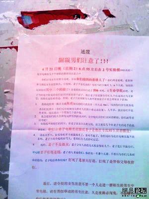 事情源于該女生在4月21日晚的一次不愉快的電梯經(jīng)歷。據(jù)稱,當(dāng)晚6點(diǎn)55分左右,該位女生在2號(hào)實(shí)驗(yàn)樓與幾個(gè)“齷齪男”一起乘電梯。期間,女生慘遭“齷齪男”們毛手毛腳。雖然當(dāng)時(shí)十分憤怒,但鑒于一個(gè)人“勢(shì)單力薄”,被“猥褻”的女生忍著沒(méi)有作聲。她暗暗記下了幾個(gè)“齷齪男”上課的實(shí)驗(yàn)室,并寫下這張大字報(bào),貼在大學(xué)校園內(nèi)。