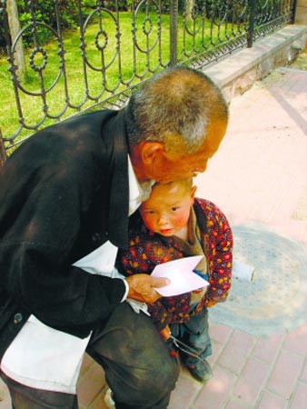 昨日,濟(jì)南泉城廣場西南角,坐著一名老漢,身旁一個小男孩在地上爬來爬去。記者正想上去問問,圍觀的一名大娘頭一扭,壓低聲音和同伴說起了啥,記者豎起了耳朵,“這是祖孫倆嗎?不是拐賣小孩的吧,還是裝乞丐騙錢呢……好像是個殘疾人呢……”錯!人家是爺倆,不是祖孫倆!他們來濟(jì)南是為了找工作。