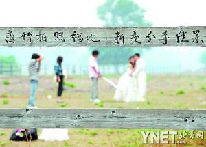 緊鄰的木柵欄上,一對(duì)新人在攝影師的指導(dǎo)下趴在上面拍照。不遠(yuǎn)處另一對(duì)新人則站在了柵欄上面。盡管場(chǎng)地內(nèi)沒有一匹馬,而且圍欄上寫有如此的警示語(yǔ),但新人們都無(wú)所顧忌地以馬場(chǎng)為背景拍照。有一對(duì)新人還和攝影師鉆過木柵欄,進(jìn)入馬場(chǎng)拍攝。