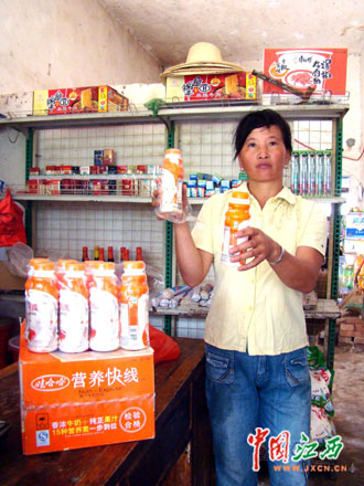 當(dāng)日上午,記者驅(qū)車來到墩上村實(shí)地采訪。今年41歲的鄒根枝兒女都在外務(wù)工,和丈夫鄒新海兩人在家?guī)腿搜b殼子板,每天120多元的收入讓兩人很是滿足,平時(shí)除了吃飯外還特意買些原料補(bǔ)充營養(yǎng)。鄒根枝介紹說:“6月20日,我從墩上村鄒德水的便利店里買來一箱娃哈哈營養(yǎng)快線,當(dāng)時(shí)怕飲料不新鮮,還特意看了生產(chǎn)日期,見是2009年5月31日生產(chǎn)的才放心買了回去,放在家里晚上看電視的時(shí)候喝,有些時(shí)候我老公(鄒新海)也喝一瓶,但沒有我喝得多。幾天后,我感覺肚子不舒服,上吐下瀉,為此專程搭車到萬年縣石鎮(zhèn)街去買胃藥,花了差不多200元錢病情卻不見好轉(zhuǎn),而且肚子痛得特別厲害。沒有辦法,我只好到屋前的墩上衛(wèi)生所去看病,打了幾天吊針以后病情才有所好轉(zhuǎn)。這次看病不僅花費(fèi)了近400元醫(yī)藥費(fèi),還耽誤了一個(gè)多星期沒有干活,就連前兩天插秧都是請(qǐng)人干得,我的損失可大了!