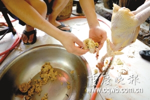 昨上午,四家經(jīng)營(yíng)戶之一、在興隆街經(jīng)營(yíng)了12年活雞鴨生意的劉德彬(化名)說,近兩年,自貴州運(yùn)來自稱是“土雞”,出現(xiàn)一種怪現(xiàn)象:雞胃被灌了一種“飼料”——用石粉攪成糊狀,再加幾粒玉米!斑@種雞每只比正常喂養(yǎng)雞至少重0.25公斤以上……我實(shí)在看不下去了,幾經(jīng)考慮才說出這個(gè)秘密。”