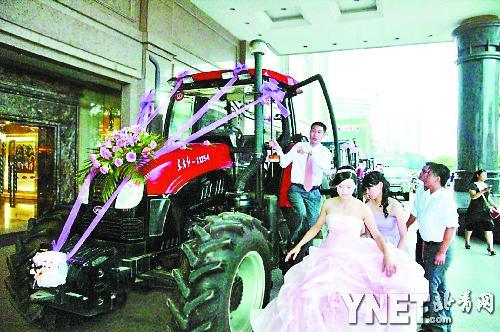 29日下午,由18輛拖拉機(jī)和多輛寶馬、奔馳等組成的浩浩蕩蕩的迎親車隊(duì),由廣東湛江市麻章區(qū)出發(fā)開往婚禮舉辦場(chǎng)所——湛江市“皇冠假日酒店”,沿途引來了大批市民駐足。