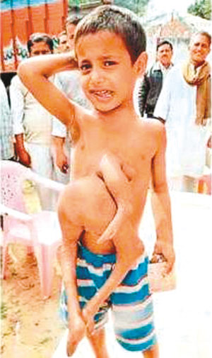 據(jù)德國《圖片報(bào)》2月19日?qǐng)?bào)道,現(xiàn)年8歲的迪帕克·庫馬爾是一名來自印度比哈爾邦的小男孩。從一出生,他的外貌就把周圍的人驚得目瞪口呆:他長(zhǎng)著4條腿和3支手臂,在他腹中有個(gè)孿生弟弟和他一起來到這個(gè)世界上。