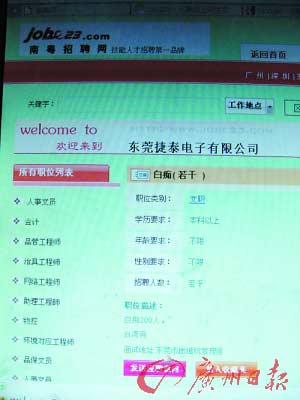 記者在網(wǎng)上搜索,果然看到了報料人所說的招聘信息,分別發(fā)布在南粵招聘網(wǎng)和東莞智通人才網(wǎng)和“我搜網(wǎng)”上。招聘信息注明了職位類別是文職,招聘期限為2010年2月26日至5月26日。在學歷要求方面,“白癡”要求本科以上,“人妖”要求初中以上,年齡和性別要求則不限,工作地點在東莞。